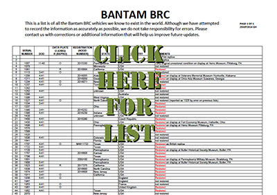 We are very proud to present a complete list of all the known Bantam Reconnaissance Cars in the world. Similar lists have been established for a number of years for the two other prototype jeeps which followed the BRC, the Ford GP and the Willys-Overland MA, and this list is kept roughly in that form for those interested in all the pre MB/GPW jeeps. As simple as the list looks, it was a daunting task to complete, accomplished by Austin Bantam Society members George Hollins and Bill Spear, with George doing the lion's share of the recent work, updating Bill's list and additions and last seen in the BRC Special Edition of Rooster Tails, the Journal of the Austin Bantam Society, available to ABS members.